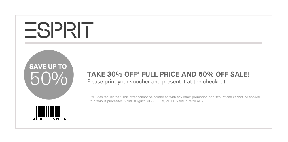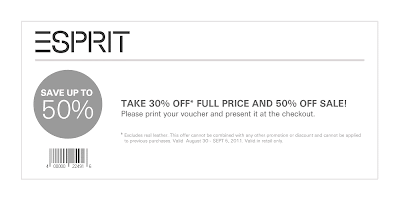Here's a ESPRIT coupon that will save you 30% off regular priced items and 50% off sale items. The coupon is valid in-stores until Monday, September 5, 2011. Just present the coupon to the cashier when you checkout to redeem.
