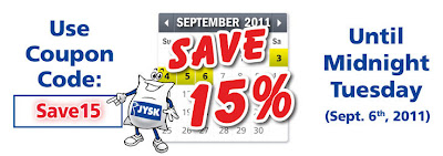 Until September 6, 2011, shop at JYSK online and save 15% off your purchase. Simply use the promo code SAVE15 at checkout to receive the discount.