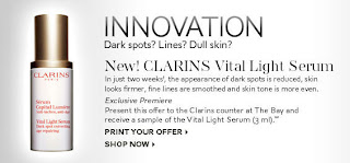Visit a Clarins counter at the Bay by September 30, 2011, present the printable coupon and receive a FREE sample of Clarins Vital Light Serum (3 mL). There is a limit of one per customer while quantities last.