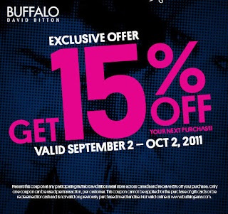 Buffalo David Bitton is offering a 15% off your entire purchase printable coupon. This promotion is valid until October 2, 2011. The coupon must be surrendered at time of purchase and cannot be combined with any other coupon or offer.