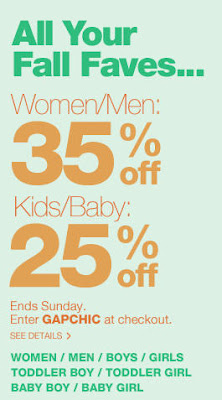 Gap Canada has an online sale today where you can save 35% off Men and Women's merchandise and 25% of Kids and Baby items. The sale ends today (Sunday, September 11, 2011). To take advantage of this sale, enter the promo code GAPCHIC at checkout.