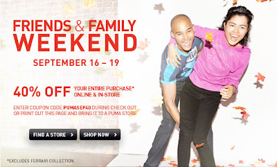 PUMA has a Friends and Family sale this weekend (September 16-19, 2011) where you can save 40% off your entire purchase (excludes Ferrari collection)! This sale is available in-store and online. You can also save 30% off at PUMA outlet stores.