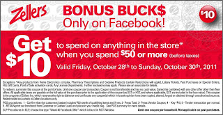 Zeller's Facebook page has an exclusive coupon where you can get $10 to spend on anything in the store when you spend $50 or more. The coupon is valid from Friday, October 28 to Sunday, October 30, 2011. There's a limit of one coupon her household.