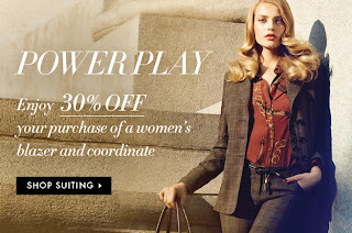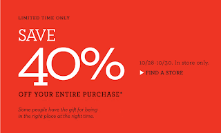You can save 40% off your entire purchase when you shop at Banana Republic this weekend (October 28-30, 2011). The sale is only available in-store. I don't think you need a coupon or anything to take advantage of this sale, but you can always print out the email that Banana Republic sent me with you just in case.