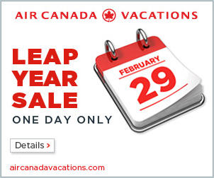 To celebrate the leap year, if you book an Air Canada Vacations package today (February 29, 2012), you can upgrade to Executive Class for only $29 per person, roundtrip! That's a savings between $299 to $599! This deal is so good that it only comes along once every 4 years.
