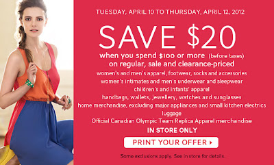 The Bay's website has a new coupon where you can save $20 when you spend $100 or more (before taxes) on regular, sale and clearance-priced items. This offer is available in-store only until Thursday, April 12, 2012. Make sure you read the coupon's fine print beforehand as it excludes some items.