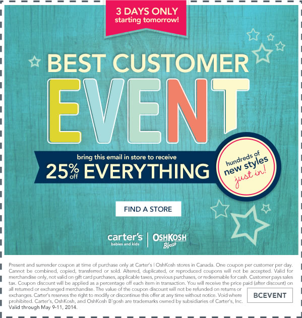 You can save an extra 25% off everything in-store at Carters | OshKosh with this printable coupon. Just print the coupon and present it to the cashier at time of purchase. The coupon is valid at all Carters | OshKosh stores in Canada until Sunday, May 11, 2014.