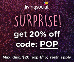 - Take 20% off your next purchase for almost any deal on LivingSocial.com when you use promo code “POP”.