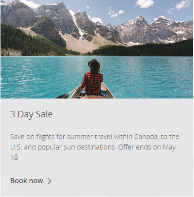 For a limited time only, enjoy the summer and save on flights within Canada, to the U.S. and sun destinations if you book by Thursday, May 18, 2017 at 11:59pm EDT.