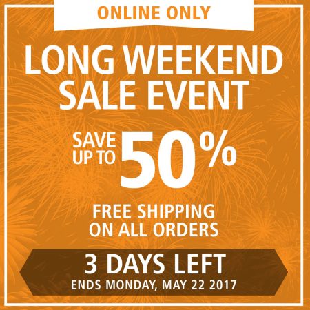 Save up to 50% off + free shipping on all orders. The sale is available online only until Monday, May 22, 2017.