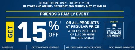 FRIENDS AND FAMILY: This offer is valid Friday, May 26 as of 2:00 p.m., online only at rona.ca (for the participating stores), and Saturday and Sunday, May 27 and 28, 2017, at participating stores and at rona.ca (for the participating stores). Consumers save 15% with any purchase of $100 or more (before taxes). Only purchases of products at regular price paid in cash, debit or credit card are eligible. This offer also applies on products being delivered and/or installed if delivery and/or installation charges are paid in full at time of purchase.