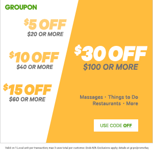 Save up to an incredible extra $30 off on Groupon when you enter the promotion code OFF at checkout: