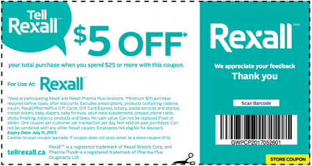 Save $5 off when you spend $25 or more with this coupon. The coupon is valid at all Rexall stores across Canada until Tuesday, July 11, 2017.