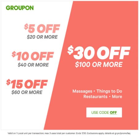 Save up to an incredible extra $30 off on Groupon when you enter the promotion code OFF at checkout: