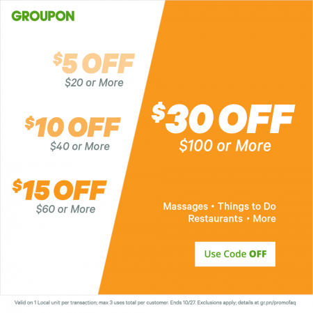 Save up to an incredible extra $30 off on Groupon when you enter the promotion code OFF at checkout:
