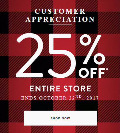Save 25% off your entire purchase! The sale is available in-stores and online now until Sunday, October 22, 2017 at 11:59pm EST. The discount will be automatically applied at checkout.