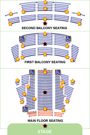 - Seating: main floor, first balcony, or second balcony