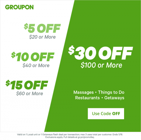 Save up to an incredible extra $30 off on Groupon when you enter the promotion code OFF at checkout:
