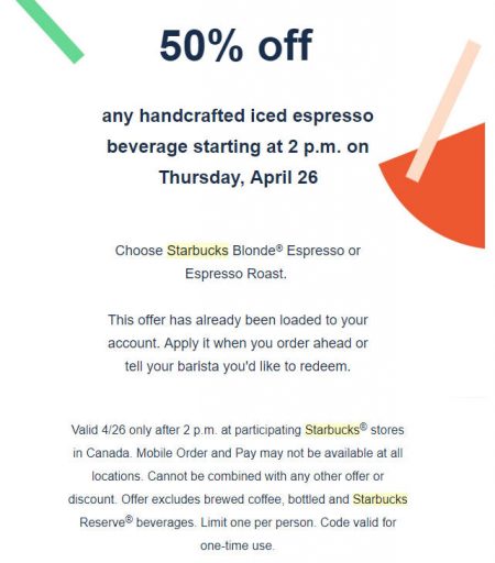 Valid 4/26 only after 2 p.m. at participating Starbucks stores in Canada. Mobile Order and Pay may not be available at all locations. Cannot be combined with any other offer or discount. Offer excludes brewed coffee, bottled and Starbucks Reserve beverages. Limit one per person. Code valid for one-time use.