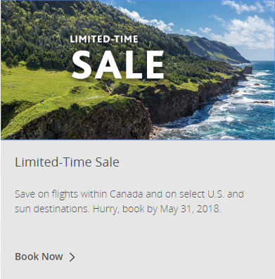 For a limited time, save on select flights within Canada and on select U.S. and sun destinations if you book by Thursday, May 319, 2018 at 11:59pm MT.