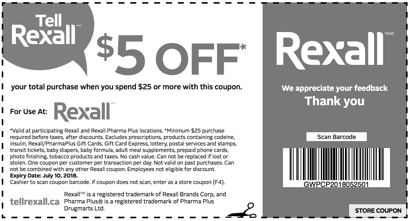 Save $5 off when you spend $25 or more with this coupon. The coupon is valid at all Rexall stores across Canada until July 10, 2018.