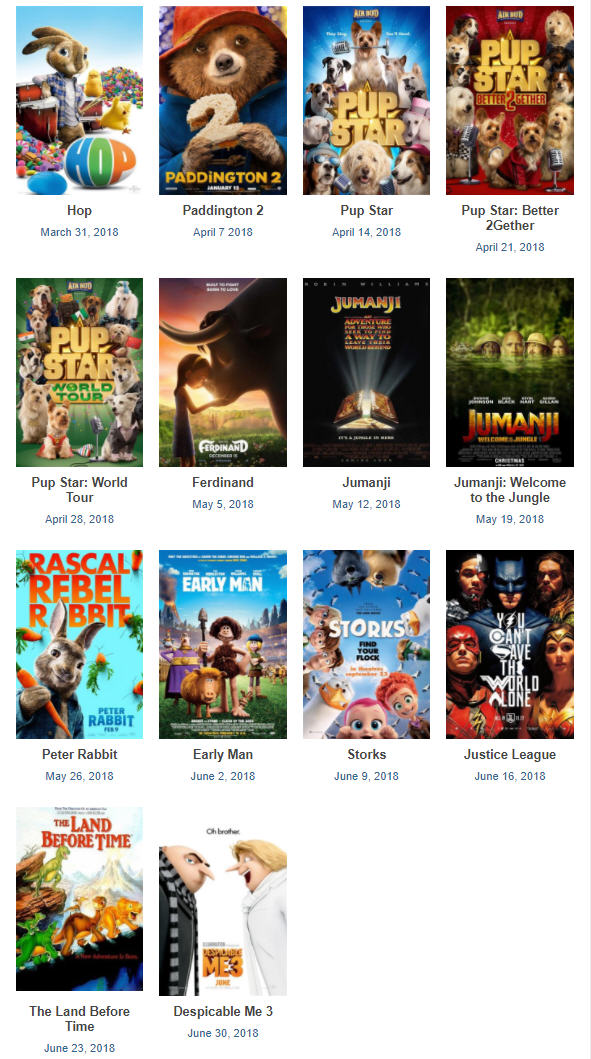 March 31: HopApril 7: Paddington 2April 14: Pup StarApril 21: Pup Star: Better 2GetherApril 28: Pup Star: World TourMay 5: FerdinandMay 12: JumanjiMay 19: Jumanji: Welcome to the JungleMay 26: Peter RabbitJune 2: Early ManJune 9: StorksJune 16: Justice League- June 23: The Land Before Time