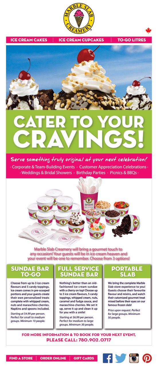 Catering option includes services offered by an experienced catering team that specializes in creating delicious food for small (10-29), medium (30-49), and large (50+) groups. Servings (ice creams with toppings mixed in an individually chosen way) offered can be consumed during corporate and team-building events, customer appreciation celebrations, weddings, bridal shows, picnic, BBQs, and birthday parties. Catering options range from the Sundae Bar To-Go, Full Service Sundae Bar or the Portable Slab. For more information see the full offer of catering options.