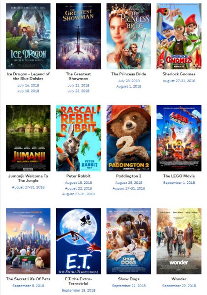 July 14 & July 18: Ice Dragon - Legend of the Blue DaisiesJuly 21 & July 25: The Greatest ShowmanJuly 28 & August 1: The Princess BrideAugust 4 & August 8: Sherlock GnomesAugust 11 & August 15: Jumanji: Welcome To The Jungle- August 18 & August 22: Peter Rabbit