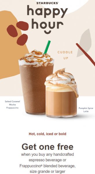 Buy a grande or larger handcrafted Frappuccino blended beverage or a grande or larger handcrafted espresso beverage, get one of equal or lesser value free during Happy Hour on Thursday, September 27, 2018 from 2pm–close (in your time zone).