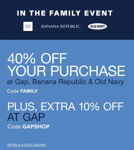 Gap, Banana Republic and Old Navy are offering a 40% off promo code. 3 brands. 1 code. 1,000’s of deals.