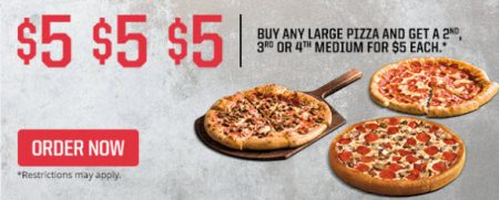For a limited time, order any large pizza at regular price, and get the 2nd, 3rd, and 4th medium pizza for only $5 bucks each!