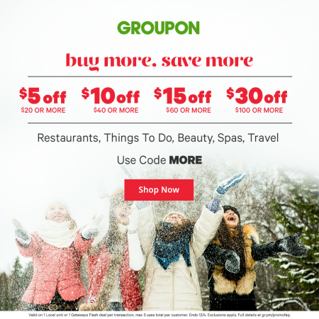Today only, save up to an incredible extra $30 off on Groupon when you enter the promotion code MORE at checkout: