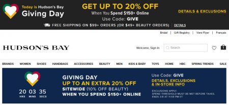 Hudson’s Bay: Giving Day - Up to an Extra 20% Off Sitewide Promo Code (Mar 8)