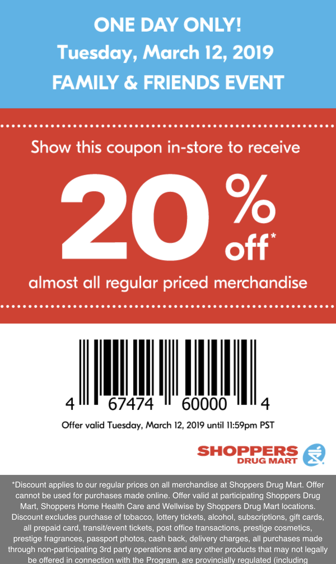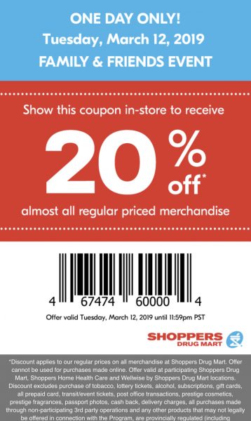 Shoppers Drug Mart: Friends & Family Event - 20% Off Regular Priced Items (Mar 12)