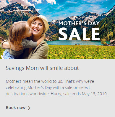 Surprise her with the gift of travel. Hurry, sale ends May 13, 2019. Book now.