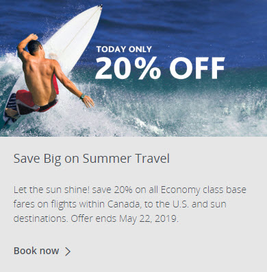 For a limited-time, 20% on all Economy class base fares with promotion code K98TPWX1 on flights within Canada, to the U.S. and sun destinations