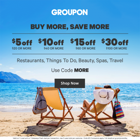 Today only, save up to an incredible extra $30 off on Groupon when you enter the promotion code MORE at checkout: