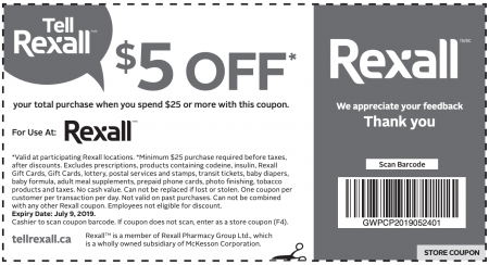Save $5 off when you spend $25 or more with this coupon. The coupon is valid at all Rexall stores across Canada until July 9, 2019.