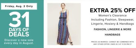 - Extra 25% Off Women’s Clearance including Fashion, Sleepwear, Lingerie, Hosiery & Handbags