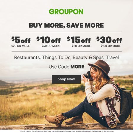 Today only, save up to an incredible extra $30 off on Groupon when you enter the promotion code MORE at checkout: