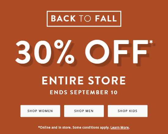 Save 30% off your entire purchase in-stores and online until Tuesday, September 10, 2019 at 11:59pm EST. The discount will be automatically applied at checkout.