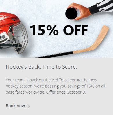 To celebrate the new hockey season, Air Canada’s passing you savings of 15% on all base fares worldwide with promotional code “GNM43YN1“.