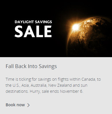 What’s better than an extra hour of sleep? Savings on flights! Right now, save on flights within Canada, to the U.S., Asia, Australia, New Zealand and sun destinations. Travel until April 30, 2020.