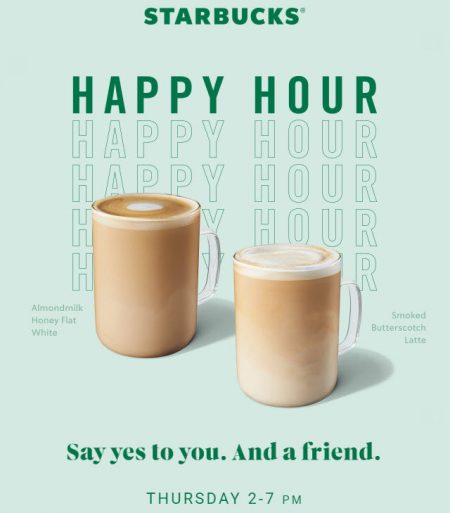 Buy a grande or larger handcrafted beverage, get one of equal or lesser value free during Happy Hour on Thursday, January 23, 2020 from 2pm–7pm (in your time zone). Excludes hot brewed coffee, hot brewed tea, ready–to–drink beverages and Starbucks Reserve beverages