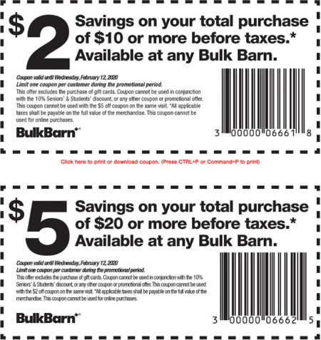 Click here to print Bulk Barn’s $2 or $5 off coupon.