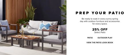 Save 25% off select patio. Be ready to soak in every sunny spring day with outdoor furniture and accessories for every space.