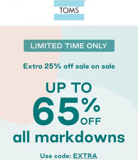 Extra 25% off markdowns on TOMS.com from 12:00 am PDT on April 16, 2020 through 11:59 pm PDT on April 21, 2020. Offer does not apply to full-priced items, gift cards, taxes, shipping or any other fees. Please enter promotion code EXTRA at checkout. Cannot be combined with other promotions, offers or discounts (other than any shipping promotions that may be in effect). Offer not valid on previously purchased merchandise. Offer is subject to adjustment due to returns, cancellations or exchanges. TOMS Shoes, LLC reserves the right to extend, modify, or discontinue these offers at any time.