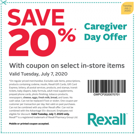 Save 20% off on select in-store items with this coupon. The coupon is valid at all Rexall stores across Canada on Tuesday, July 7, 2020 only. Mobile or printed coupons accepted.