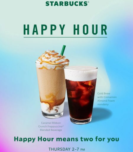 Buy a grande or larger handcrafted beverage, and get one of equal or lesser value free during Happy Hour on Thursday, July 9, 2020 from 2pm–7pm (in your time zone). Excludes hot brewed coffee, hot brewed tea, ready–to–drink beverages and Starbucks Reserve beverages