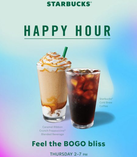 Starbucks‘ Happy Hour is back with a BOGO deal (Buy One, Get One Free).